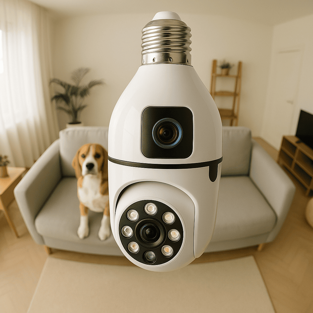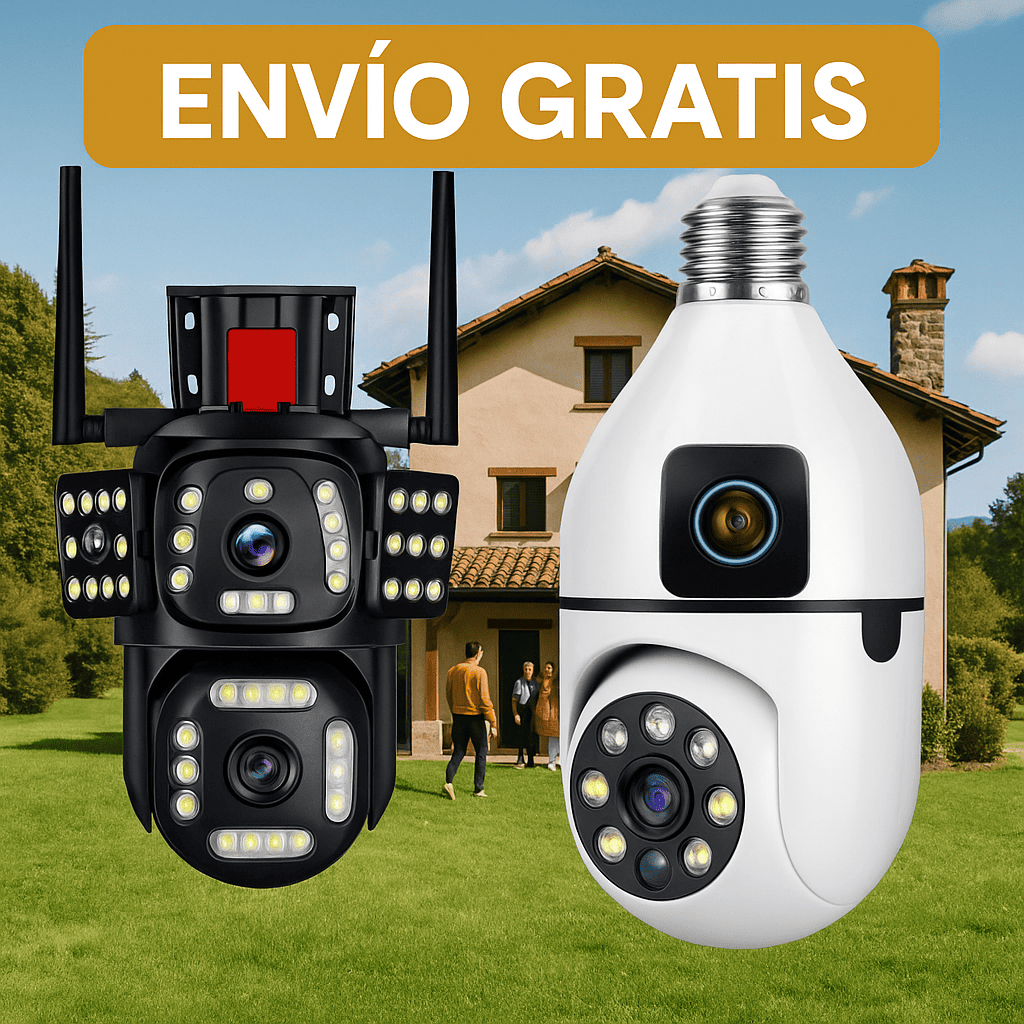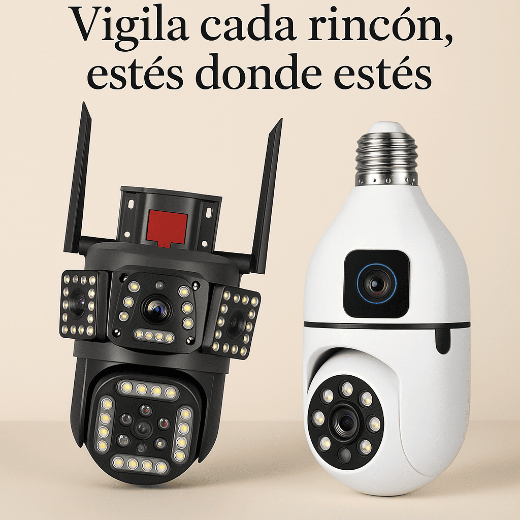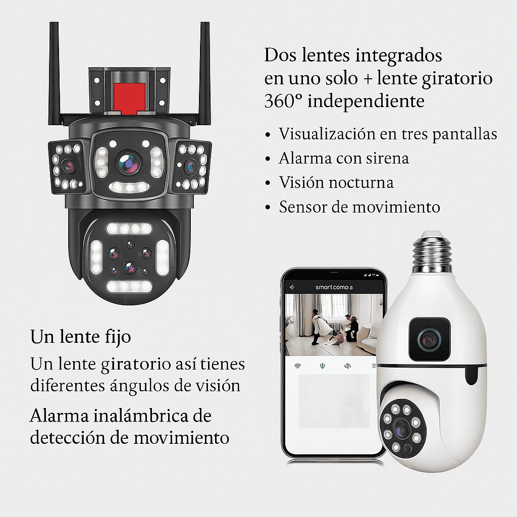 Una para vigilar el exterior o espacios amplios con visión 360°, y otra discreta tipo bombillo para cuidar cada rincón de tu interior.
